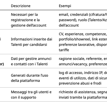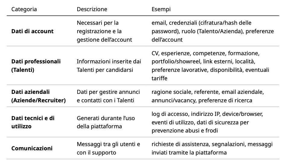 CategoriaDescrizioneEsempiDati di accountNecessari per la registrazione e la gestione dell’accountemail, credenziali (cifratura/hash delle password), ruolo (Talento/Azienda), preferenze dell’accountDati professionali (Talenti)Informazioni inserite dai Talenti per candidarsiCV, esperienze, competenze, formazione, portfolio/showreel, link esterni, località, preferenze lavorative, disponibilità, eventuali tariffeDati aziendali (Aziende/Recruiter)Dati per gestire annunci e contatti con i Talentiragione sociale, referente, email aziendale, annunci/vacancy, preferenze di ricercaDati tecnici e di utilizzoGenerati durante l’uso della piattaformalog di accesso, indirizzo IP, device/browser, eventi di utilizzo, dati di sicurezza per prevenzione abusi e frodiComunicazioniMessaggi tra gli utenti e con il supportorichieste di assistenza, segnalazioni, messaggi inviati tramite la piattaforma