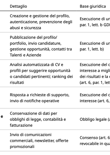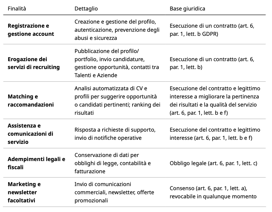 Finalità Dettaglio Base giuridica Registrazione e gestione account Creazione e gestione del profilo, autenticazione, prevenzione degli abusi e sicurezzaEsecuzione di un contratto (art. 6, par. 1, lett. b GDPR) Erogazione dei servizi di recruiting Pubblicazione del profilo/portfolio, invio candidature, gestione opportunità, contatti tra Talenti e AziendeEsecuzione di un contratto (art. 6, par. 1, lett. b) Matching e raccomandazioni Analisi automatizzata di CV e profili per suggerire opportunità o candidati pertinenti; ranking dei risultatiEsecuzione del contratto e legittimo interesse a migliorare la pertinenza dei risultati e la qualità del servizio (art. 6, par. 1, lett. b e f)Assistenza e comunicazioni di servizio Risposta a richieste di supporto, invio di notifiche operativeEsecuzione del contratto e legittimo interesse (art. 6, par. 1, lett. b e f) Adempimenti legali e fiscali Conservazione di dati per obblighi di legge, contabilità e fatturazioneObbligo legale (art. 6, par. 1, lett. c) Marketing e newsletter facoltativi Invio di comunicazioni commerciali, newsletter, offerte promozionaliConsenso (art. 6, par. 1, lett. a), revocabile in qualunque momento